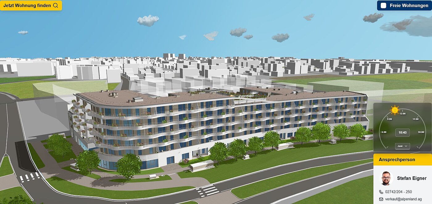Visualisierung der Wohnanlage mittels 3D-Wohnungsfinder inkl. Möglichkeit zur Darstellung der Sonneneinstrahlung. Zusätzlich kann man auf einen Klick (rechts oben) alle freien Wohnungen anzeigen lassen, oder für eine Detailsuche die integrierte Suche (links oben) nutzen.